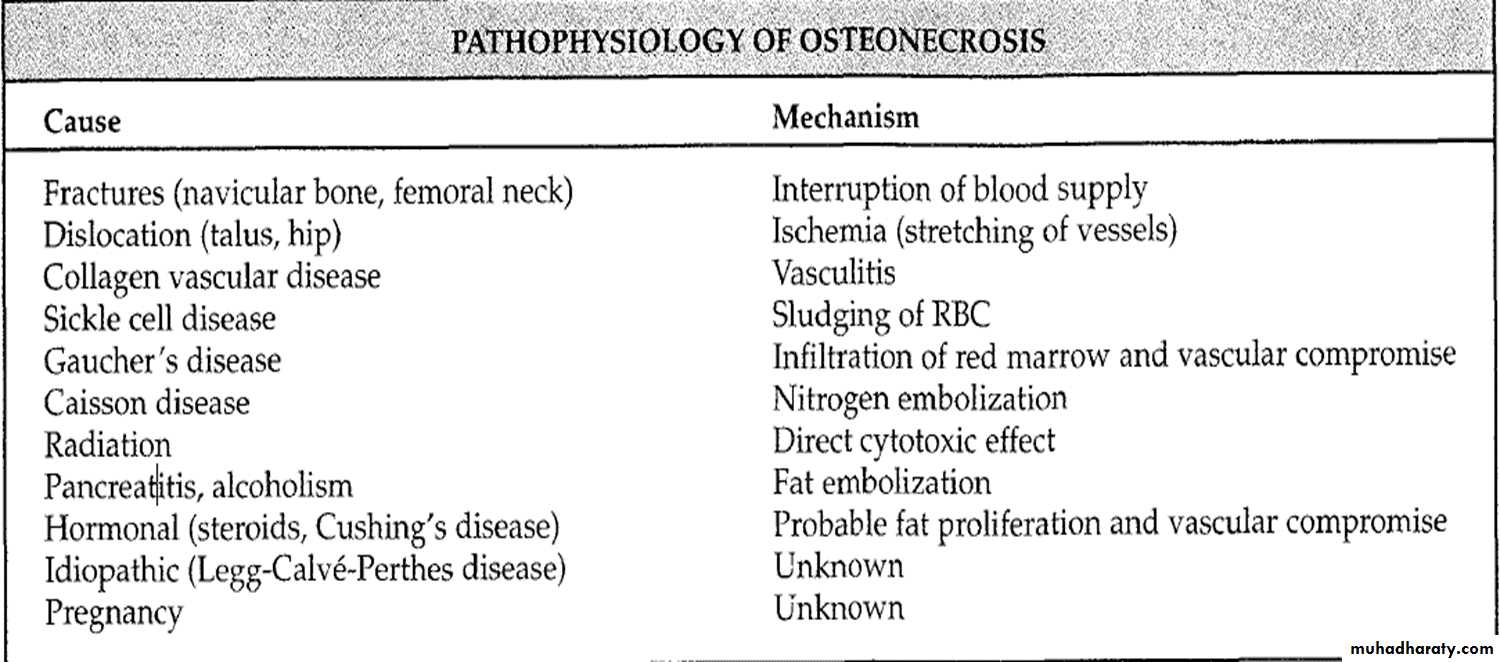 Osteonecrosis (avascular necrosis, ischemic necrosis, aseptic necrosis) may be caused by two mechanisms:* Interruption of arterial supply