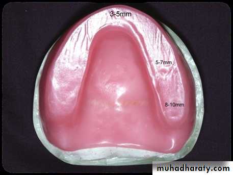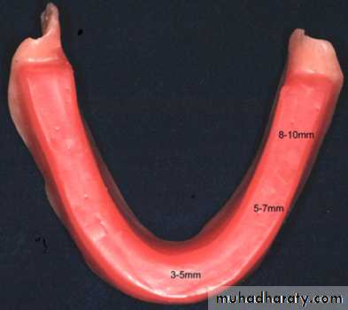 Should be thin at the crest , labial & buccal slopes to provide space for tooth arrangement.