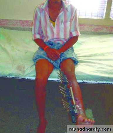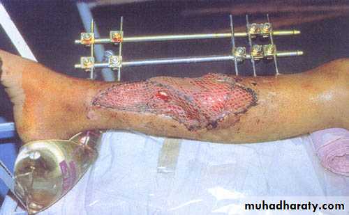 Stabilizing the fracture is important in reducing the likelihood of infection and assisting recovery of the soft tissues. The stabilization of the fracture is usually by external fixationWound closure :