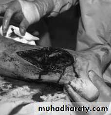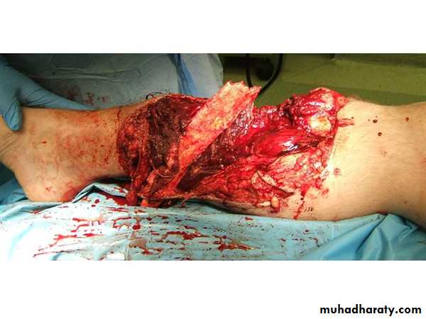 The operation aims to render the wound free of foreign material and of dead tissue, leaving a clean surgical field and tissues with a good blood supply throughout. Under general anesthesia the patient’s clothing is removed, while an assistant maintains traction on the injured limb and holds it still. The dressing previously applied to the wound is replaced by a sterile pad and the surrounding skin is cleaned. The pad is then taken off and the wound is irrigated thoroughly with copious amounts of physiological saline. The wound is covered again and the patient’s limb then prepped and draped for surgery. It is advisable not to use tourniquet in this condition unless if there is sever bleeding or arterial injury to deal with .