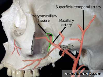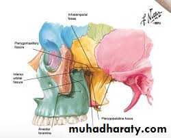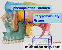 1. The pterygomaxillary fissure: transmits the maxillary artery from the infratemporal fossa, the posterior superior alveolar branches of the maxillary division of the trigeminal nerve and the sphenopalatine veins.2. The inferior orbital fissure: transmits the infraorbital and zygomatic branches of the maxillary nerve, the orbital branches of the pterygopalatine ganglion and the infraorbital vessels >