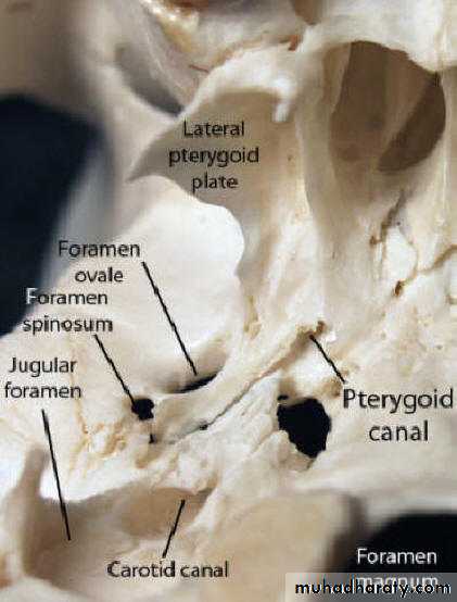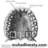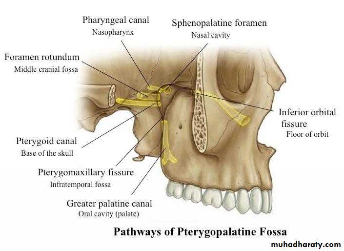 6. The opening of a palatine canal found at the base of the fossa. Lower down, the canal divides into greater and lesser palatine canals. The accompanying vessels, and these pass to the hard palate to emerge at the greater and lesser palatine foramina .