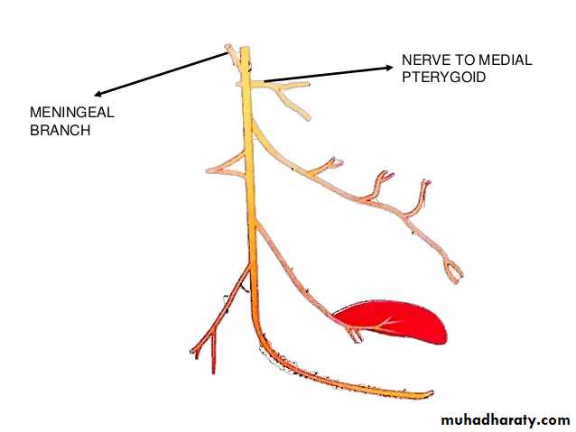 • The meningeal nerve :This is the only branch from the main trunk of the maxillary nerve that dose not originate in the pterygopalatine fossa; it arises within the middle cranial fossa , before the foramen rotundum. It runs with the middle meningeal artery and innervates the dura mater lining the middle cranial fossa.