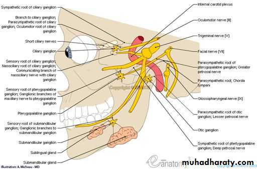 This parasympathetic ganglion is situated below the maxillary nerve in the Pterygopalatine fossa , connected by ganglionic branches. It is concerned primarily with supplying the nose, palate and lacrimal gland .as with other parasympathetic ganglia in the head , three types of fibers enter the pterygopalatine ganglion: parasympathetic, sympathetic, and sensory fibers. However , only the parasympathetic fibers synapse in the ganglion.The preganglionic parasympathetic fibers originate from the superior salutatory nucleus in the brainstem. The fibers pass with the nervus intermedius of the facial nerve. They subsequently emerge as the greater ( superficial) petrosal nerve. This occurs within the facial canal of the temporal bone, close to the geniculate ganglion of the facial nerve. The greater petrosal nerve enters the pterygoid canal. Postganglionic sympathetic fibers run to the pterygopalatine ganglion by complex course.