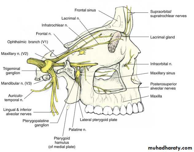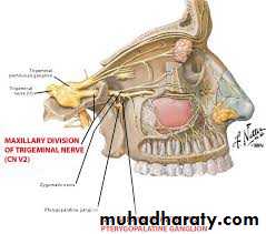 This division of the trigeminal nerve ( the fifth cranial nerve ) contains only sensory fibers. Functionally , it supplies the maxillary teeth and their sporting structures, the hard and soft palate, the maxillary air sinus, much of the nasal cavity, and skin overlying the middle part of the face.The maxillary nerve arises from the trigeminal ganglion on the floor of the middle cranial fossa. It passes along the lateral dural wall of the cavernous sinus to exit the cranial cavity at the foramen rotundum. It emerges from the foramen rotundum in the upper part of the pterygopalatine fossa, which come directly from the maxillary nerve , and those which are associated with the pterygopalatine parasympathetic ganglion.