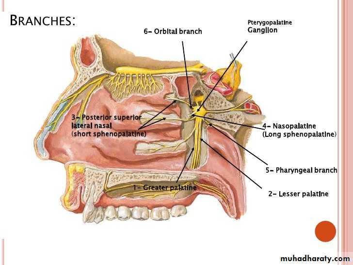 The nerve s leaving the pterygopalatine ganglion are the orbital nerve, the nasopalatine nerve , the greater and lesser palatine nerves, the posterior superior and inferior nasal nerves, and the pharyngeal. The parasympathetic component will be distributed within these nerves to supply the minor salivary glands.