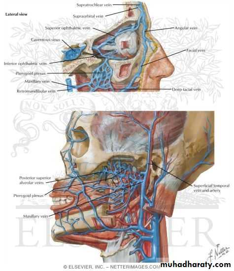 The veins of the pterygoplatine fossa are small and variable . the most consistent is the sphenopalatine vein. This vein drains the posterior aspect of the nose and passes into pterygopalatine fossa through the sphenopalatine Foramen . it drains into the pterygoid venous plexus via the pterygomaxillary fissure.The inferior ophthalmic vein in the floor of the orbit provides a connecting branch to the pterygoid venous plexus. This vein passes through the inferior orbital fissure in the region of the pterygopalatine fossa .