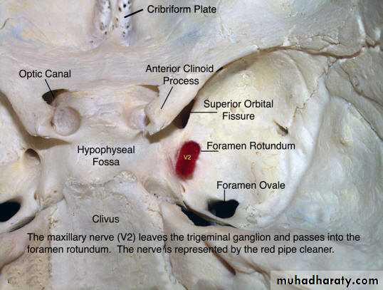 3. The foramen rotundum from the middle cranial fossa, occupying the greater wing of the sphenoid bone and transmit the maxillary division of the trigeminal nerve .