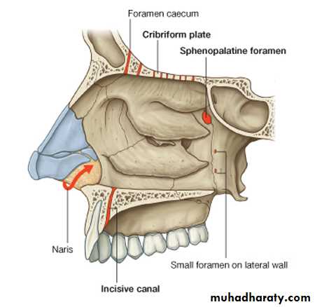 5. The sphenopalatine foramen lying high up on the nasal cavity. It transmits the nasopalatine and posterior superior nasal nerve (pterygopalatine ganglion )and the sphenopalatine vessels.