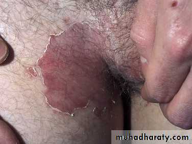 The lesions are most often unilateral (unlike candida) and begin in the crural fold.