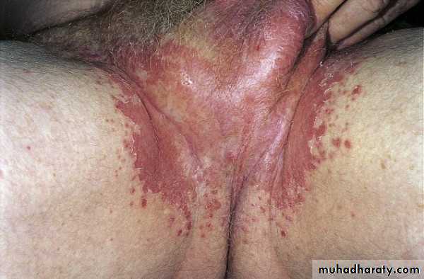 There are two clinical presentations: 1.macerated pustules that extend beyond the skin fold borders; and 2.red moist glistening plaque.
