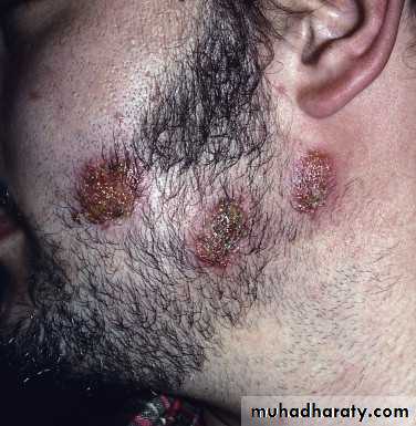 Follicular pustules may be sparse or numerous.No scale or significant hair loss (slight).