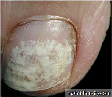 Here the fungus invades the entire thickness of the nail plate.The nail bed is spared.