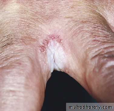 The web between the fourth and fifth toes is most commonly involved.Tight-fitting shoes are a predisposing factor.
