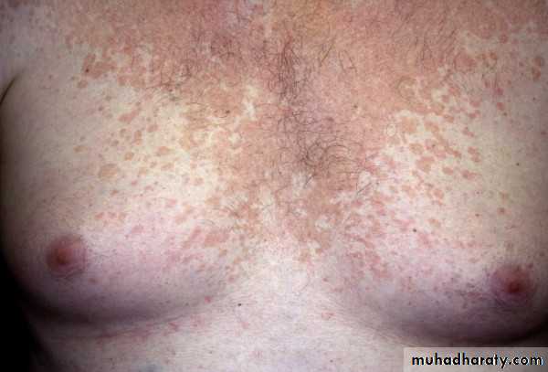 Tinea versicolor is a common fungal infection of the skin caused by the dimorphic lipophilic yeasts Pityrosporum orbiculare (round form) and Pityrosporum ovale (oval form).The organism is part of the normal skin flora and is concentrated in areas with (and years of) increased sebaceous activity.