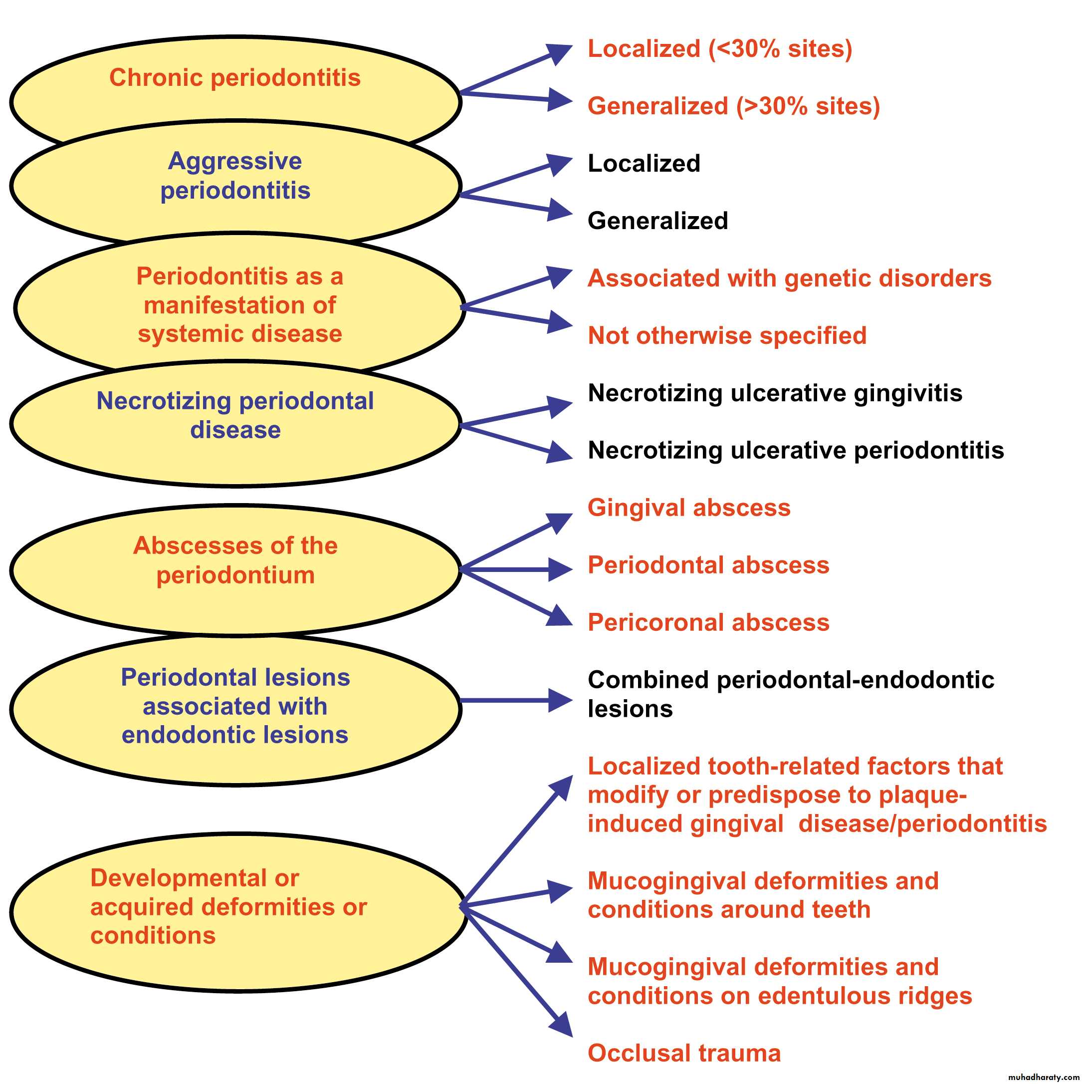 The American Academy of Periodontology classification system was established to identify distinct types of periodontal diseases by taking into consideration factors such asage of onset, clinical appearance, rate of disease progression, pathogenic microbial flora and systemic influences.