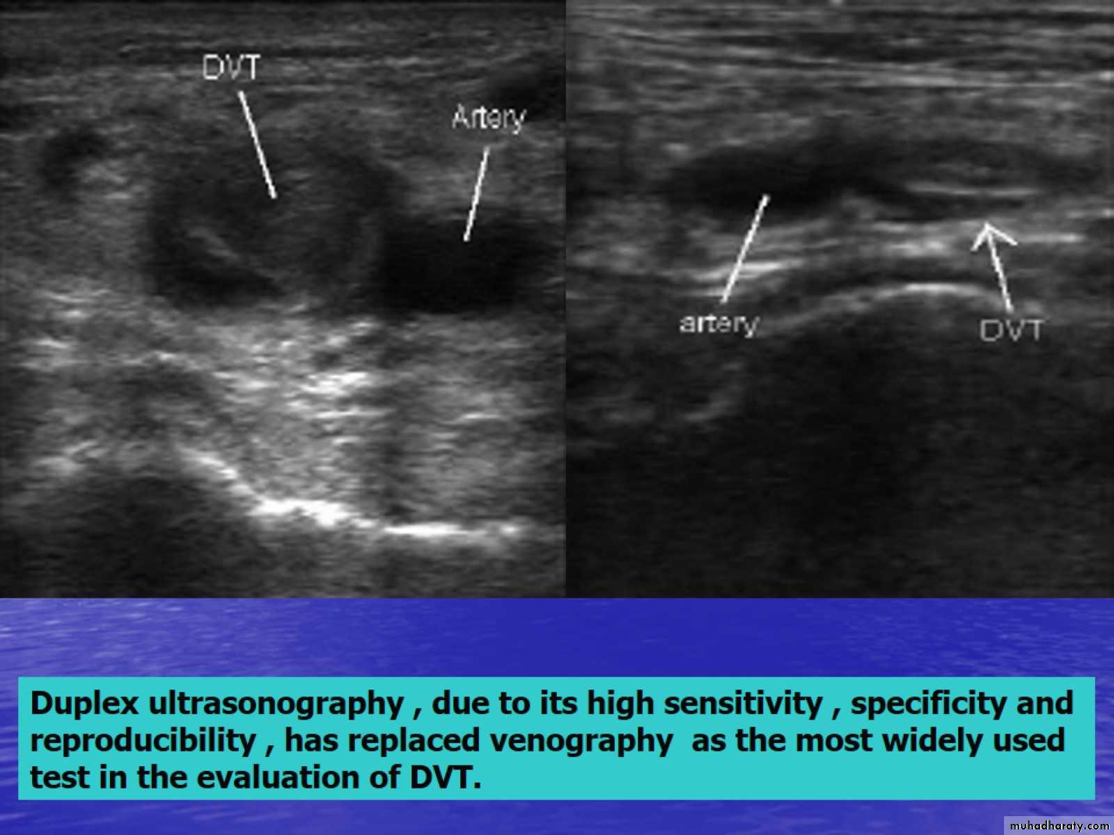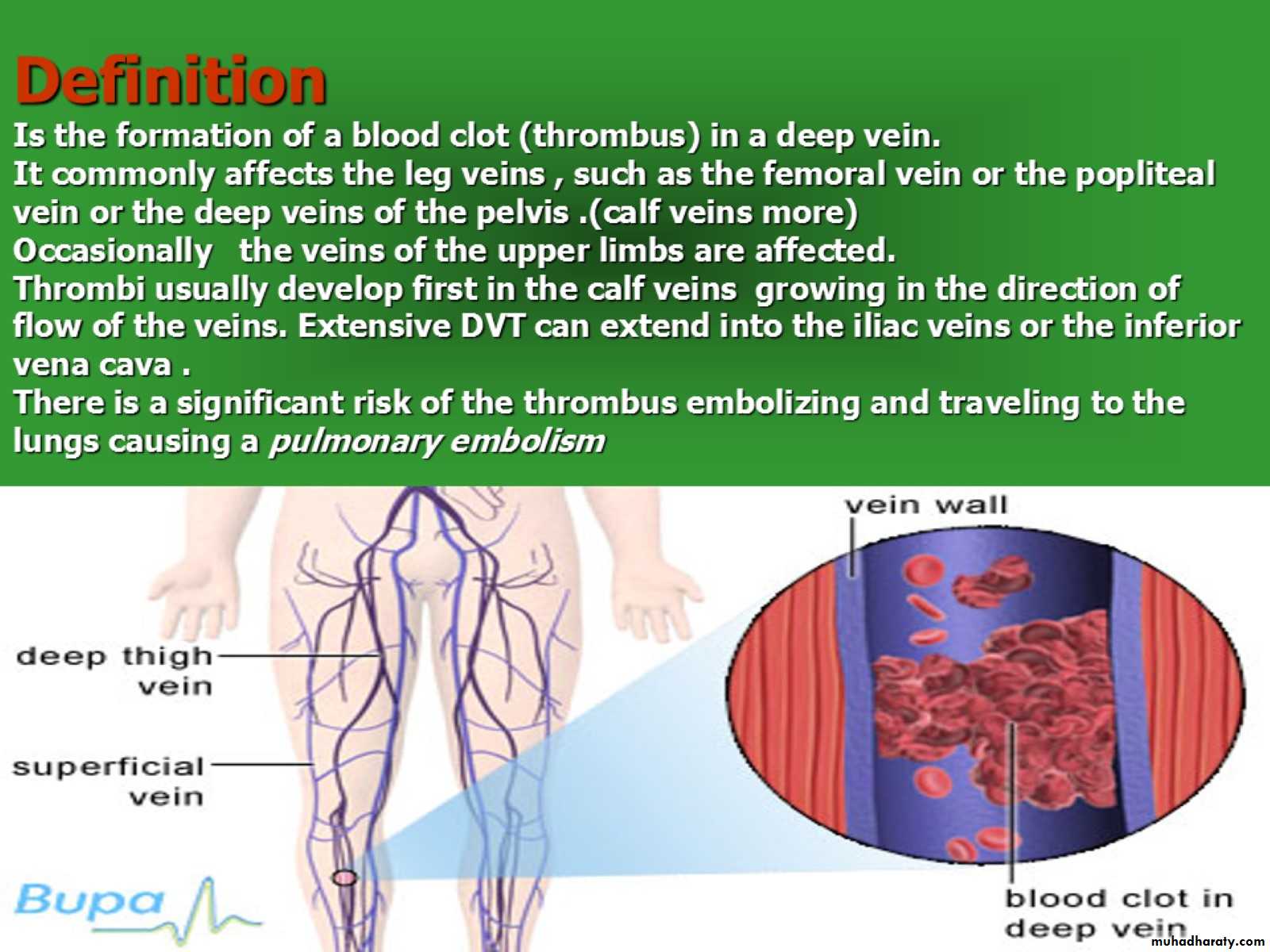 Definition Is the formation of a blood clot (thrombus) in a deep vein.It commonly affects the leg veins , such as the femoral vein or the popliteal vein or the deep veins of the pelvis .(calf veins more)Occasionally the veins of the upper limbs are affected.Thrombi usually develop first in the calf veins growing in the direction of flow of the veins. Extensive DVT can extend into the iliac veins or the inferior vena cava .There is a significant risk of the thrombus embolizing and traveling to the lungs causing a pulmonary embolism