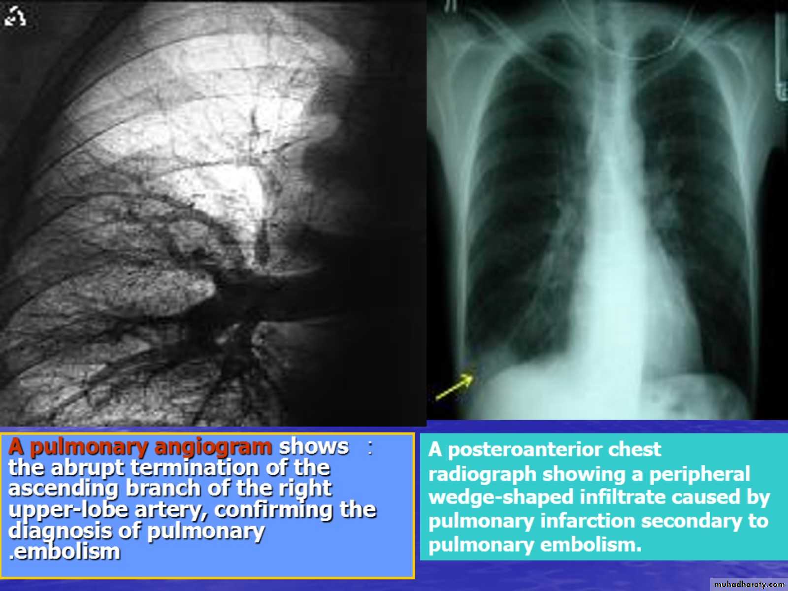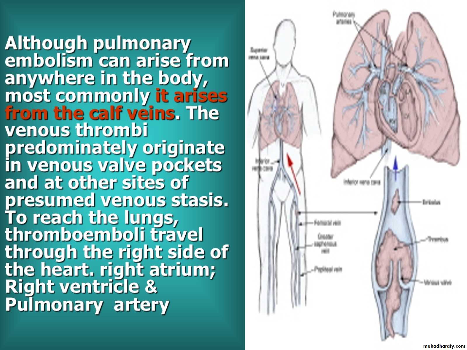 Although pulmonary embolism can arise from anywhere in the body, most commonly it arises from the calf veins. The venous thrombi predominately originate in venous valve pockets and at other sites of presumed venous stasis. To reach the lungs, thromboemboli travel through the right side of the heart. right atrium; &Right ventricle Pulmonary artery