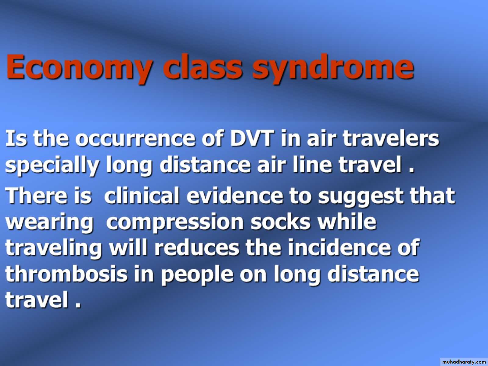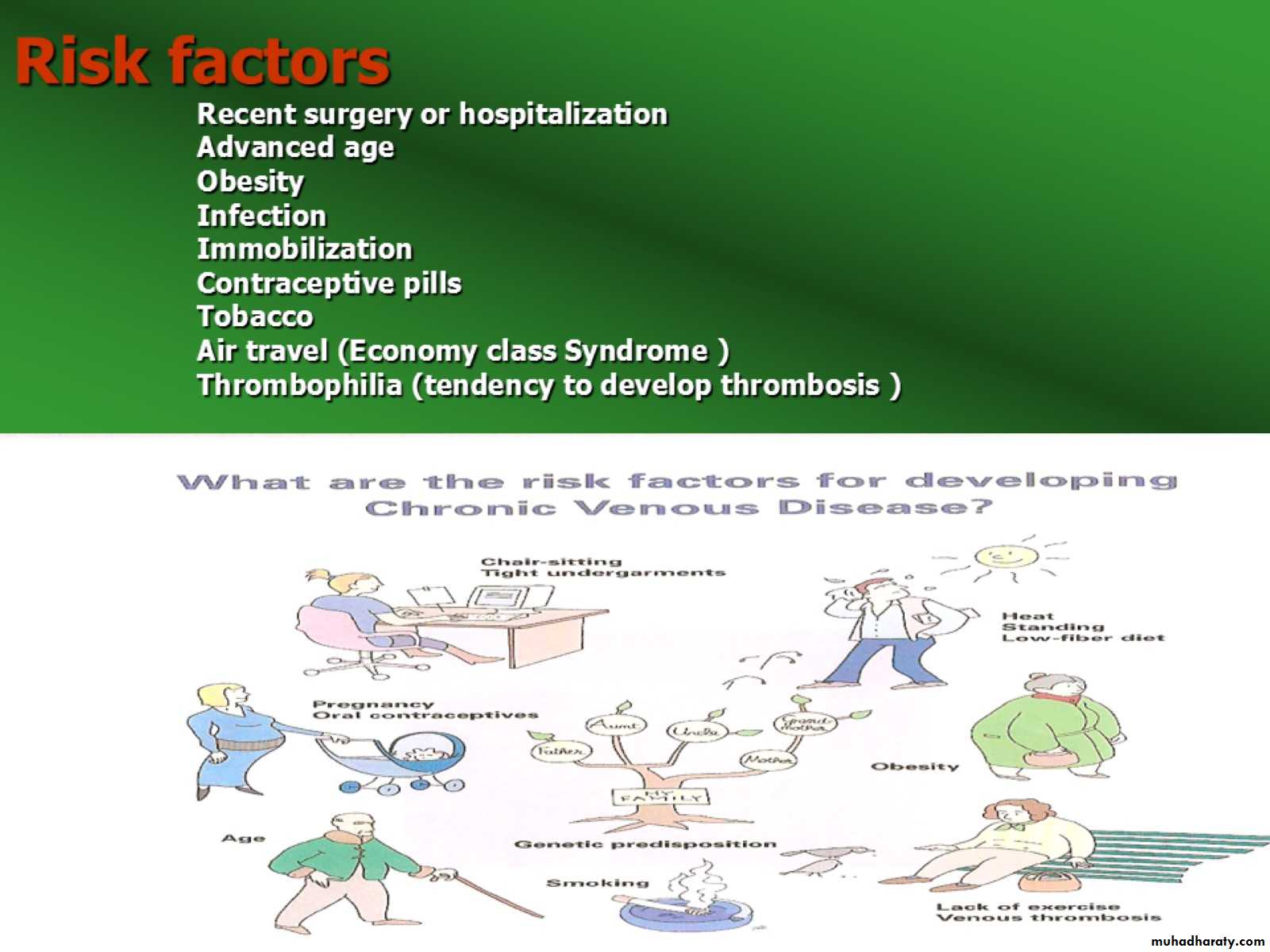 Risk factors Recent surgery or hospitalization Advanced age Obesity Infection Immobilization Contraceptive pills Tobacco Air travel (Economy class Syndrome ) Thrombophilia (tendency to develop thrombosis )