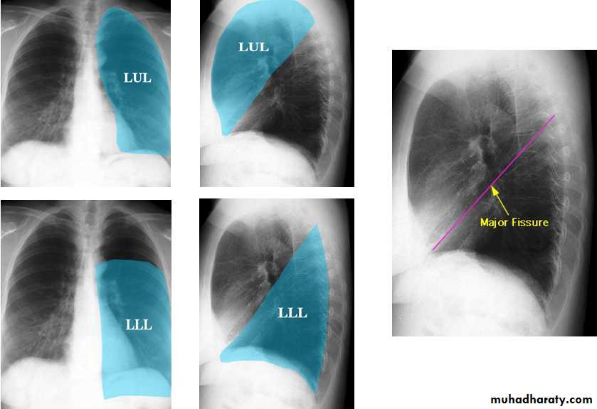 On the left the oblique fissure is in a similar position but there is usually no horizontal fissure, and so there are only two lobes on the left.