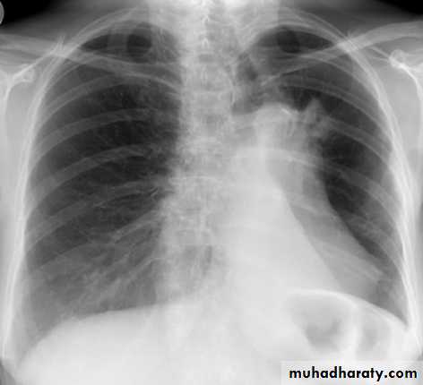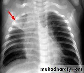 1.the initial focus of infection can be located anywhere within the lung and has non-specific appearances ranging from too small to be detectable, to patchy areas or consolidation or even lobar consolidation in RT upper or RT middle lobe . Radiographic evidence of parenchymal infection is seen in 70% of children and 90% of adults called Ghon lesion , +/- ipsilateral hilar or paratracheal Lymph adenopathy usually right sided