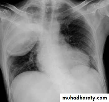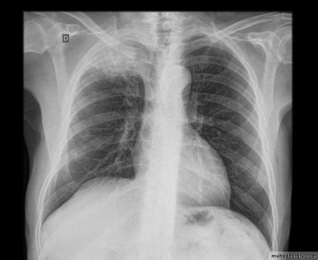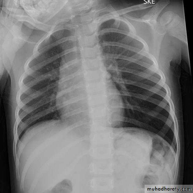 hyperinflation of the right middle and lower lobe result in increased translucency of the mid and lower parts of the right lung