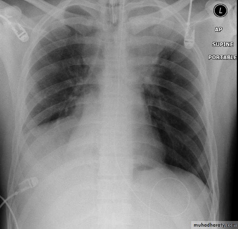 On an erect chest radiograph, recognition of hydropneumothorax can be rather easy - and is clasically shown as an air-fluid level. On the supine radiograph, this may be more challenging where a sharp pleural line is bordered by increased opacity lateral to it within the pleural space may sometimes suggest towards the diagnosis 3,