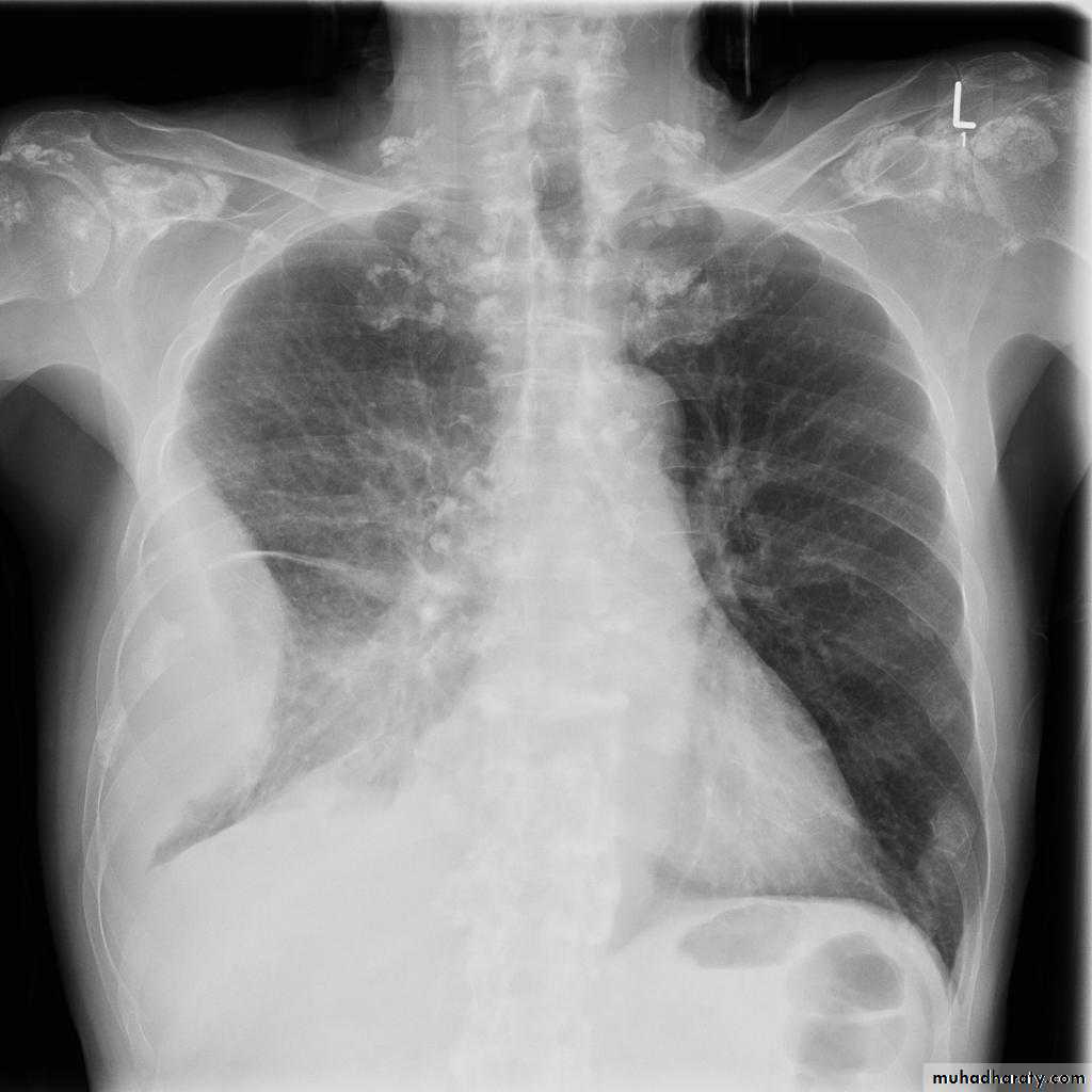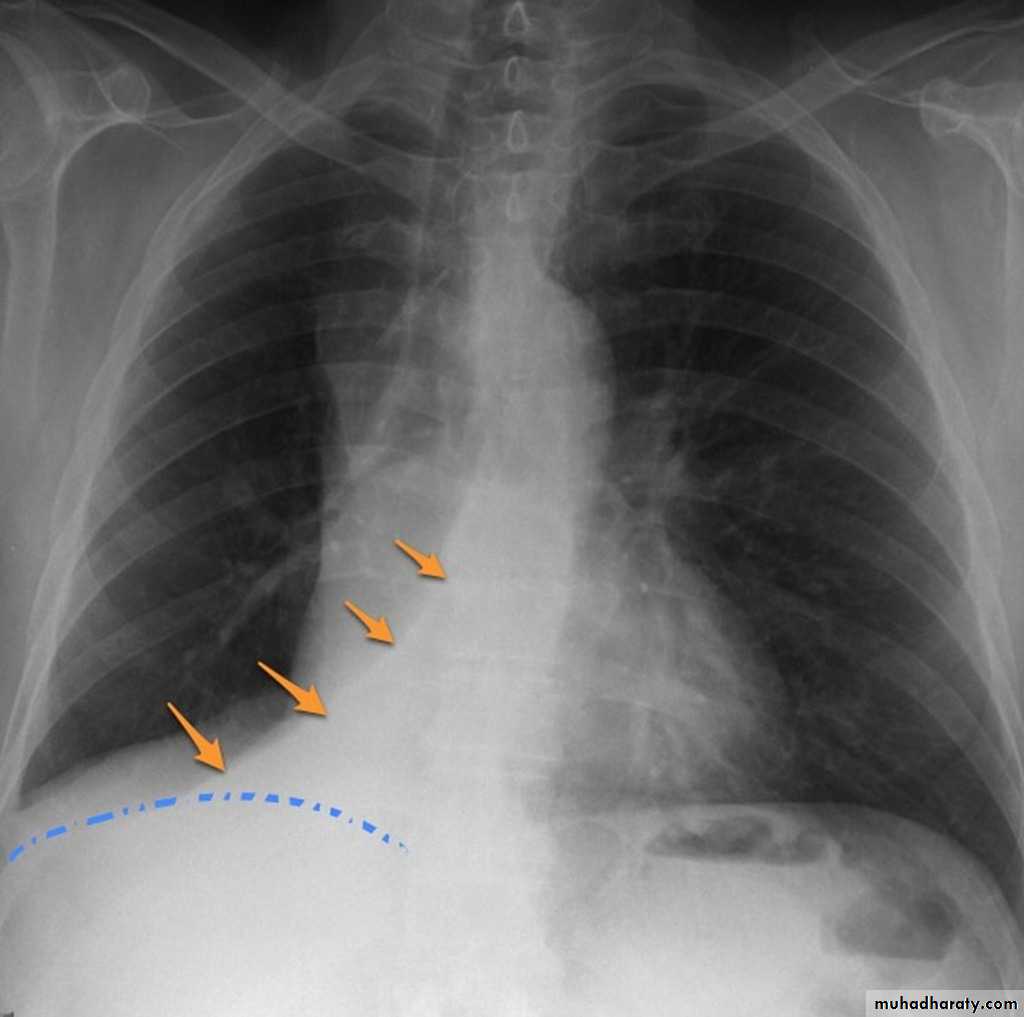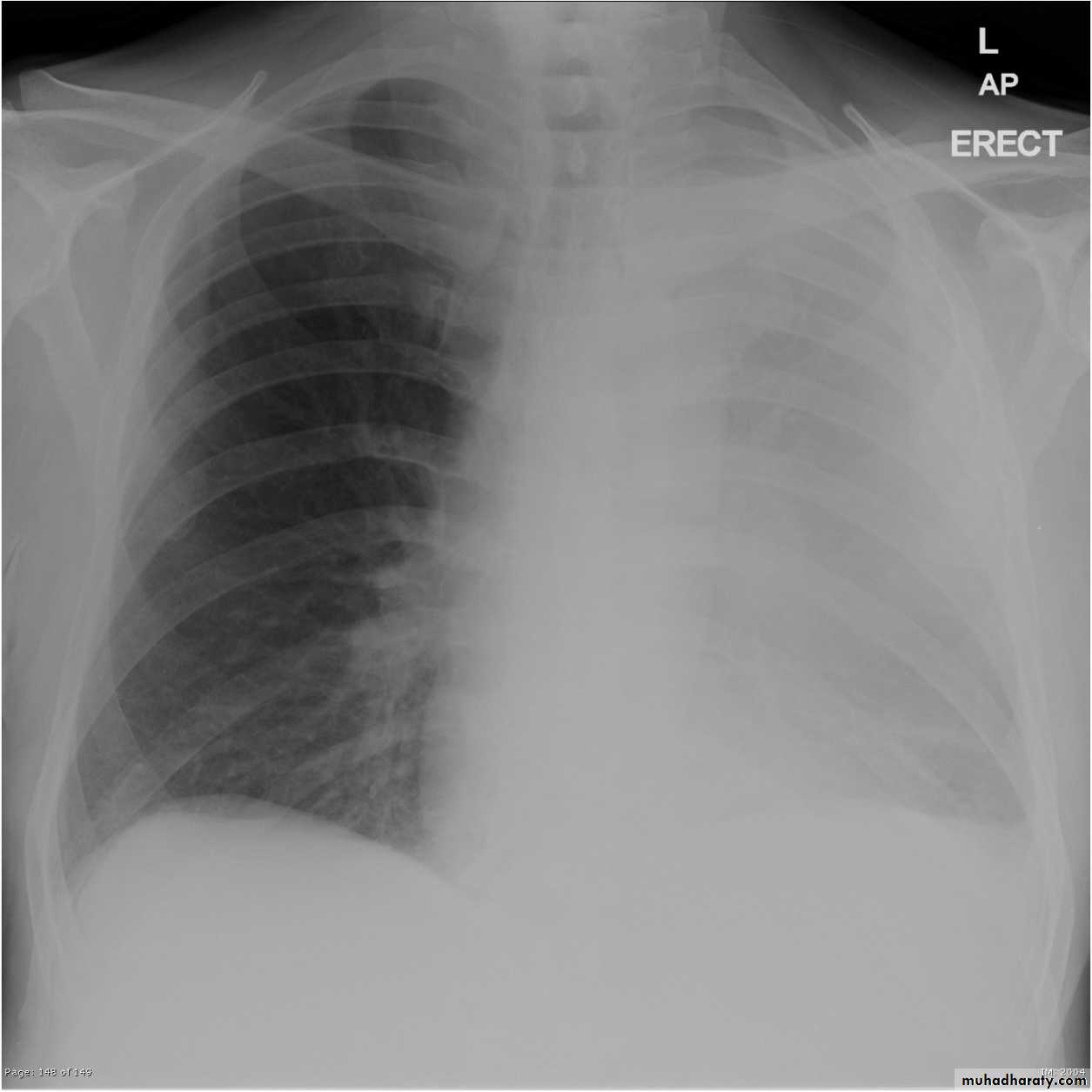 manifests as airspace shadowing that abuts the right hemidiaphragm,
