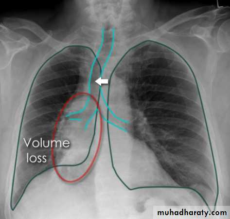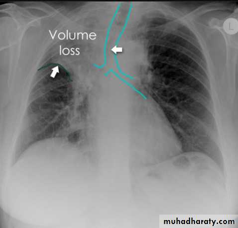 Collapse of the right upper lobe is usually relatively easy to identify on frontal radiographs. Features consist of :