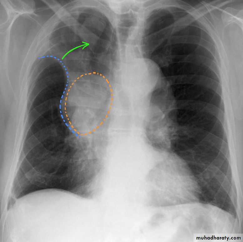 A common cause of lobar collapse is a hilar mass. When a right hilar mass is combined with collapse of the right upper lobe, the result is an S shape to elevated horizontal fissure. This is known as Golden S sign .