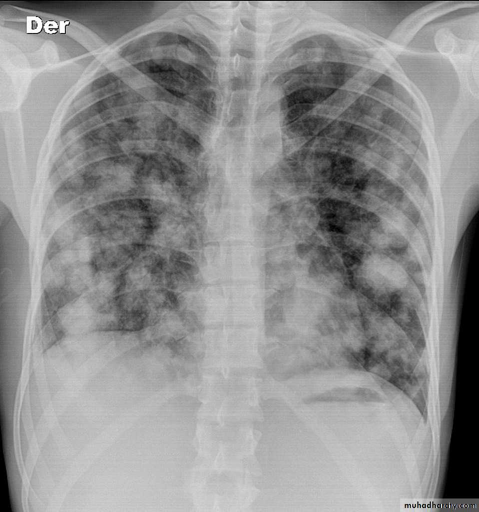 Multiple areas of opacity seen throughout the lung most often is due to bronchopneumonia, starting from bronchi and spreading outwards. Usually ill defined with peripheral distribution. Neoplasms such as a primary malignancy or metastasis can also cause this picture.