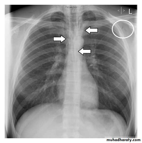 The soft tissues are often overlooked when viewing a chest x-ray, however, abnormalities of the soft tissue may give important clues to a diagnosis. Whenever you look at a chest x-ray, have a look at the soft tissues, especially around the neck, the thoracic wall, and the breasts.Soft tissue fat