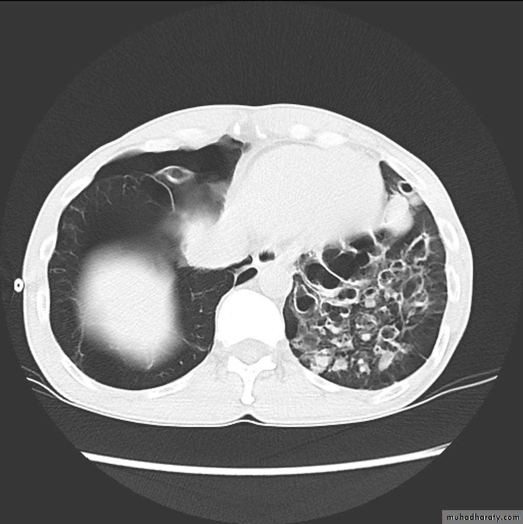 post-infective (most common)necrotising bacterial pneumonia, e.g Staph. aureus, Klebsiella, B. pertussis