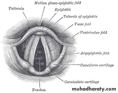 Epiglottis: It is a leaf-shaped piece of cartilage which is attached both to the base of the tongue and to the upper part of thyroid cartialge.