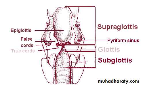 The interior of the larynx is subdivided into supraglottis, glottis and subglottis. The supraglottis is that part from the laryngeal inlet to the lower part of the laryngeal ventricle, the glottis comprises the vocal cords and arytenoids and the subglottis is that area below the cords.