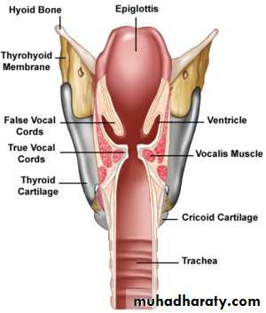 The vocal cords are two fold-like structures extending from the thyroid cartilage to the vocal process of the arytenoid cartilage. The covering epithelium of vocal cords is closely bound to the underlying structure and the blood supply is poor, hence the pearly white appearance.