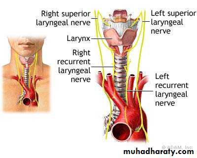 • Trauma: surgical trauma of thyroidectomy and chest surgery. The left R.L.N. being more affected by tumours and trauma than the right owing to its longer course.
