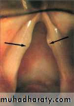 • Central lesions: since the larynx is presented on both sides of the cortex, it requires bilateral symmetrical lesions to produce laryngeal paralysis. e.g. C.V.A., intracranial tumors and bulbar palsy.