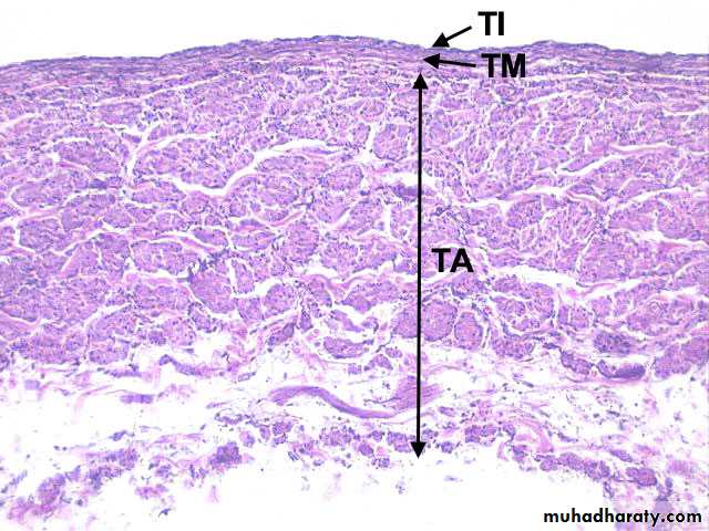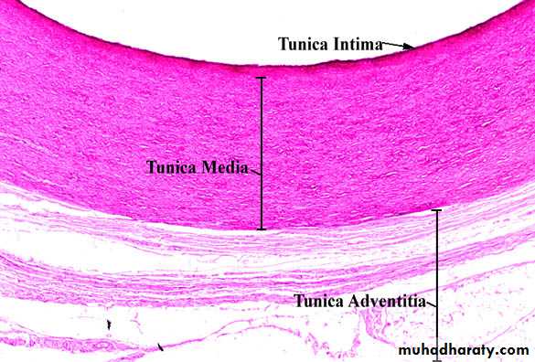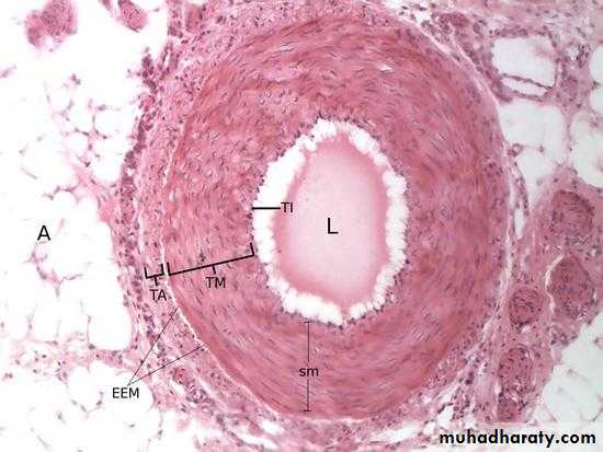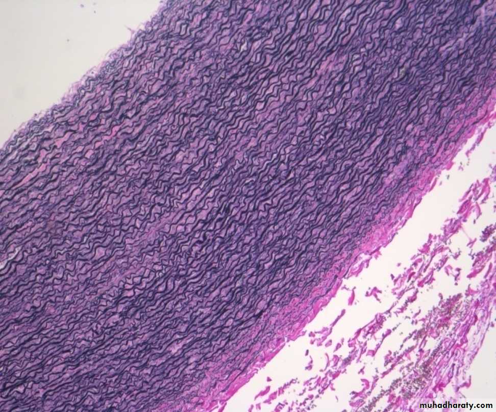 Large artary (aorta) characterize by :1-TM. Thick and consist mainly from many layer of elastic lamelea2-TA.not well developed and contain vasa vasorumElastic