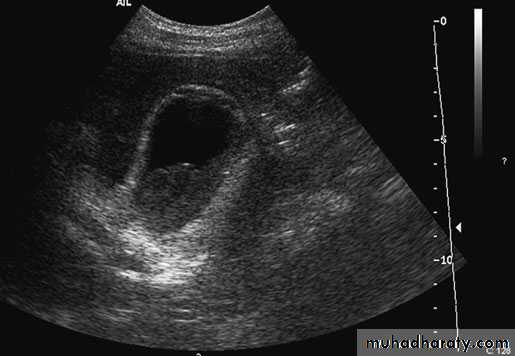 49Cholecystitis. Ultrasound demonstrates pericholecysticfluid (thin arrow), gall bladder wall (thick arrow) and biliary sludge
