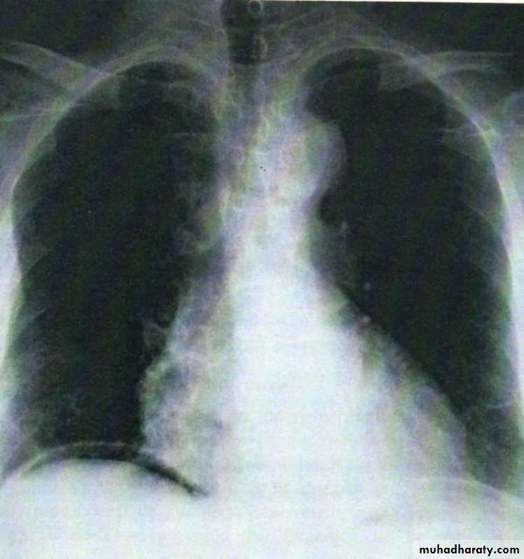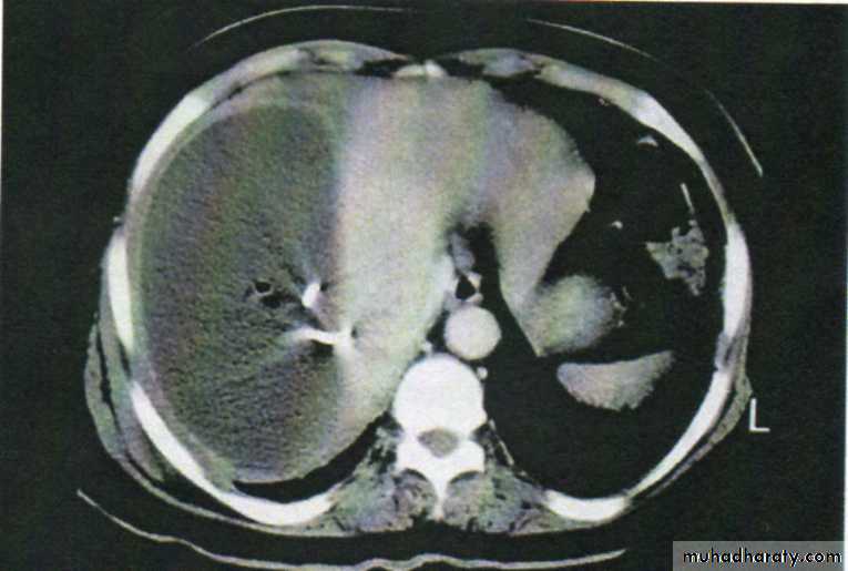 • A plain radiograph sometimes demonstrates the presence of gas or a pleural effusion. On screening, the diaphragm is often seen to be elevated (so called “tented” diaphragm) and its movements impaired.