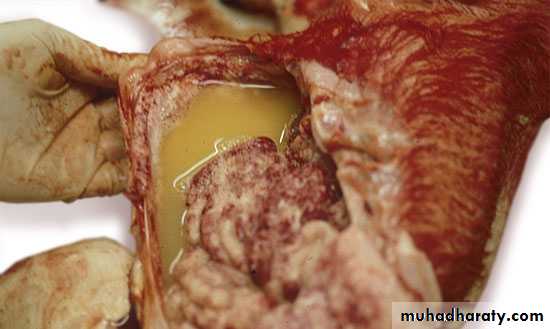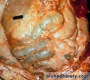 The clinical course is determined in part by the manner in which adhesions form around the affected organ. Inflamed peritoneum loses its glistening appearance and becomes reddened and velvety. Flakes of fibrin appear and cause loops of intestine to become adherent to one another and to the parietals. There is an outpouring of serous inflammatory exudates rich in leucocytes and plasma proteins that soon becomes turbid; if localization occurs, the turbid fluid becomes frank pus. Peristalsis is retarded in affected bowel and this helps to prevent distribution of the infection. The greater momentum, by enveloping and becoming adherent to inflamed structures, often forms a substantial barrier to the spread of infection.Al-Madena copy
