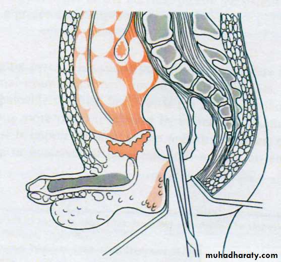 The pelvis is the commonest site of an intraperitoneal abscess because the vermiform appendix is often pelvic in position and the fallopian tubes are frequent sites of infection. A pelvic abscess can also occur as a sequel to any case of diffuse peritonitis and is common after anastomostic leakage following colorectal surgery. The most characteristic symptoms are diarrhea and the passage of mucus in the stools. Rectal examination reveals a bulging of the anterior rectal wall, which, when the abscess is ripe, becomes softly cystic. Left to nature, a proportion of these abscesses burst into the rectum, after which the patient nearly always recovers rapidly. If this does not occur, the abscess is definitely pointing into the rectum, rectal drainage (Fig. 58.6) is employed. If any uncertainty exists, the presence of pus should be confirmed by ultrasound or CT scanning with needle aspiration if indicated. Laparotomy is almost never necessary. Rectal drainage of a pelvic abscess is far preferable to suprapubic drainage, which risks exposing the general peritoneal cavity to infection. Drainage tubes can also be inserted percutaneously or via the vagina or rectum under ultrasound or CT guidance .Al-Madena copy