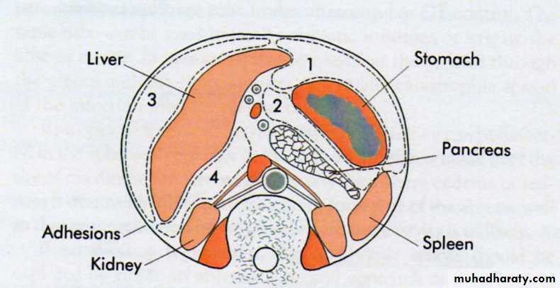This is bound above by the diaphragm and behind by the left triangular ligament and the left lobe of the liver, the gastrohepatic omentum and the anterior surface of the stomach. To the right is the falciform ligament and to the left the spleen, gastosplenic omentum and diaphragm. The common cause of an abscess here is an operation on the stomach, the tail of the pancreas, the spleen or the splenic flexure of the colon.Al-Madena copy
