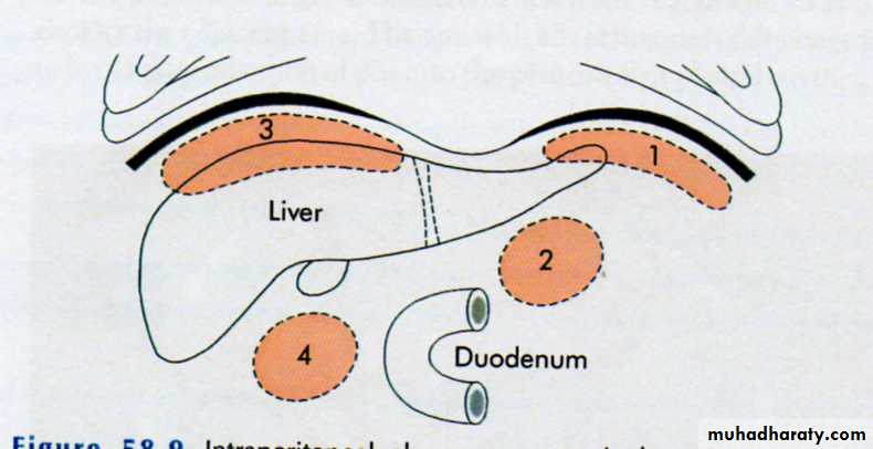 AnatomyThe complicated arrangement of the peritoneum results in the formation of four intraperitoneal spaces in which pus may collect