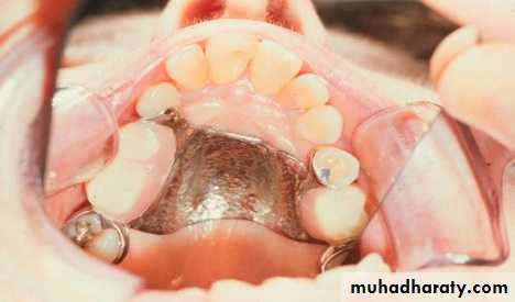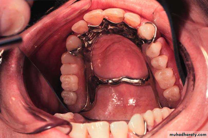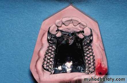 2- compensation (Acrylic and metal :metal extended over the half of the palate while acrylic is attached the border of the metal contain small (mesh work) for retention.