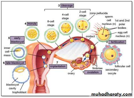 Implantation:- As soon as the Zygote is formed, it begins dividing very rapidly and within 5 days a tiny mass of cells, the blastocyst is formed.- The embryo has to escape from the Zona pellucida and the outer covering of the egg and then begin to burrow into the decidua.- The embryo remains in the fallopian tube for 3-4 days until it reaches the morula stage (8-32 cell stage), the embryo proceeds through the isthmus to the uterine cavity where it will float freely for 72 hrs.