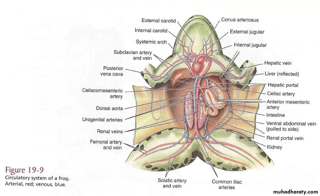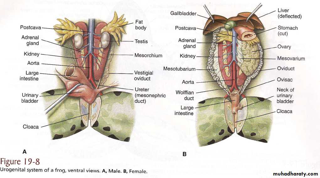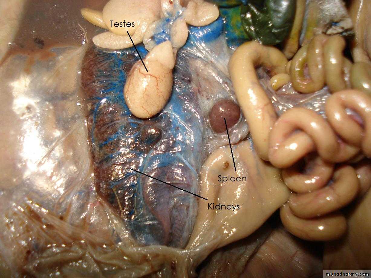 This system consist of pair of kidney , pair of ureter, urinary bladder and cloaca• Each kidney is elongated and dark red in color, and there is abroad irregular yellow patch on ventral surface of each kidney called adrenal gland.