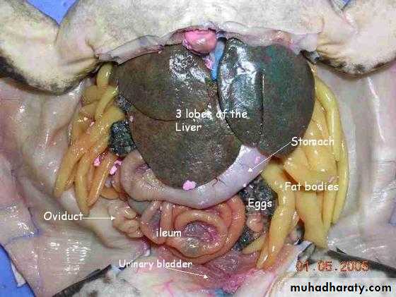 • The following accessory glands connected with the digestive system: liver 3 lobes ( with gall bladder) and pancreas,.