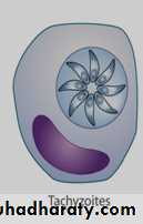 Trophozoite (endozoite, tachyzoites , zoites): the intracellular trophozoite or proliferative form usually seen during acute infection. The trophozoites are crescentic in shape, and with one end more pointed than the other. Evident in in Giemsa-stained preparation of various types of smears are a delicate azure cytoplasm and a reddish spherical or ovoidal nucleus which is usually nearer the blunter end of the parasite. Trophozoites are either single or in masses (pseudocyst).
